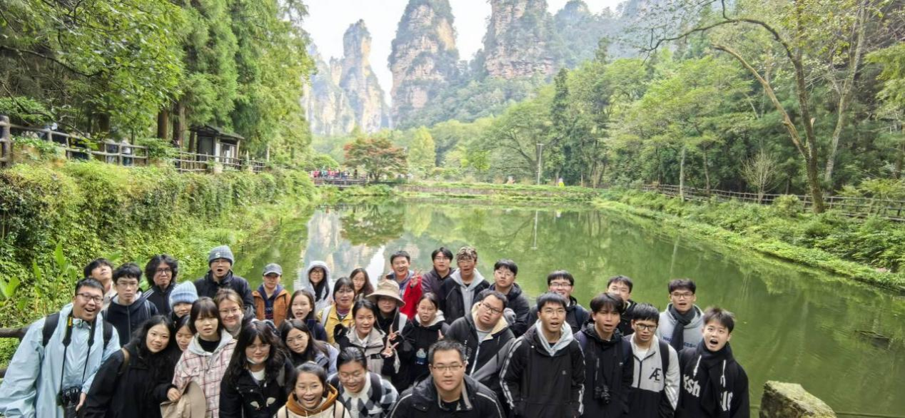 最后一站,实习队伍深入张家界国家森林公园,开启沉浸式自然地理探索。十里画廊内,老师剖析地质构造与流水侵蚀对峰林峡谷的塑造,我们在岩层的纹理里看见自然的“匠心”;天子山巅,师生徒步攀登、亲睹御笔峰奇景,岩石构成与地貌演化的关系,让我们明白“绿水青山”是自然的馈赠,更需后人的守护;黄石寨上,缆车穿梭间,岩性、地壳运动与外力作用的知识,化为我们对“生态保护”最直观的认知——专业所学,本就是守护山河的“利器”。