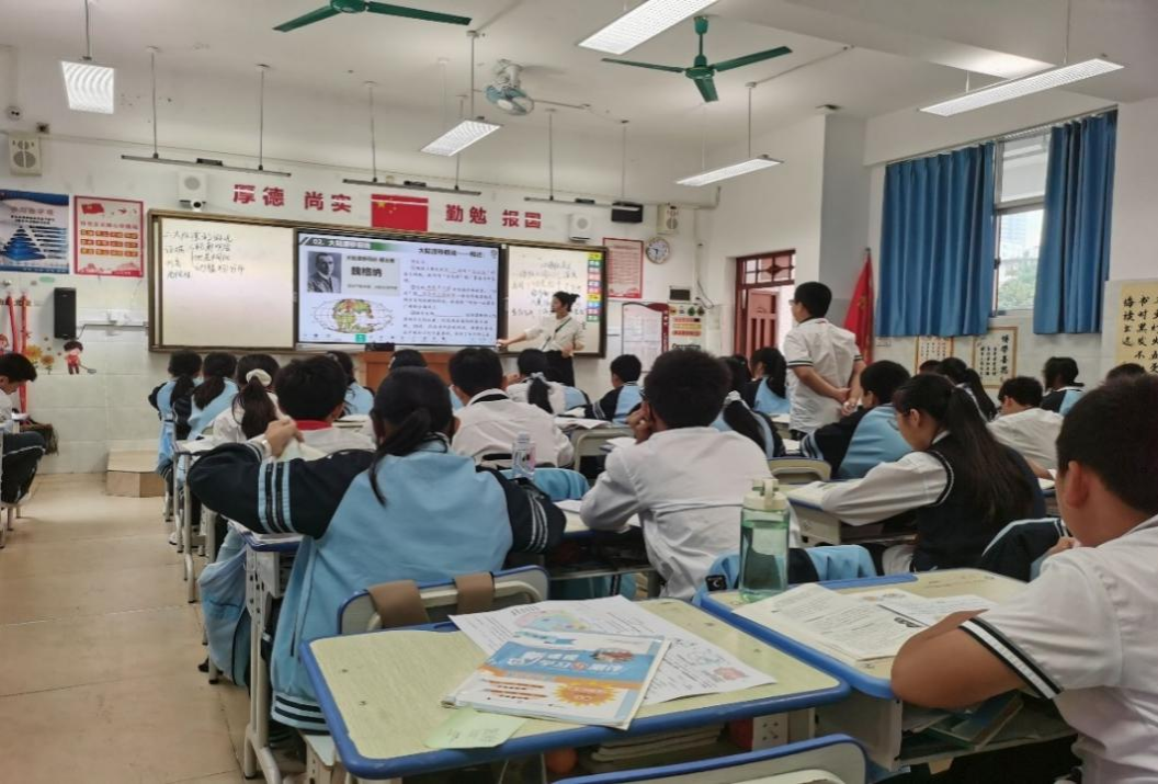实习教师陈海冰作为初一年级地理实习老师代表,在初一十一班教室进行汇报课《海陆变迁》展示。课堂教学展示时,实习教师陈海冰以“鸮头贝为海底生物,为何出现在广西陆地上?”作为导入,结合地图、材料积极引导学生思考,密切关注学生的反应,灵活调整上课节奏。