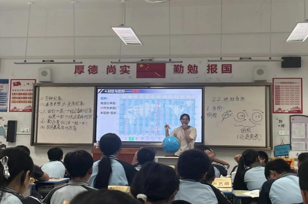 实习生秉持“一课多磨”的匠心,深度参与地理教学全过程。备课环节,在导师指导下实习生精研课标、整合素材,通过对乡土案例的个性化改编与多样化呈现,打造出贴近学生生活的探究式课堂;听课环节,日均听课3-4节,系统观摩骨干教师课堂驾驭艺术,撰写详实听课笔记数十篇;授课环节,累计完成新授课6课时、习题课6课时及公开课2课时,内容涵盖《地球与地球仪》《地球的运动》《世界的海陆分布》等核心章节。初登讲台时,部分实习生存在语速偏快、互动生涩等问题。在历经反复试讲与深度反思,实习生逐步掌握了“情境问题链驱动与教具导学”模式,课堂节奏张弛有度,学生参与度显著提升。