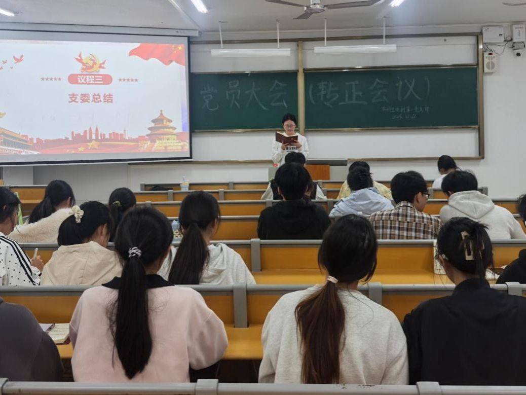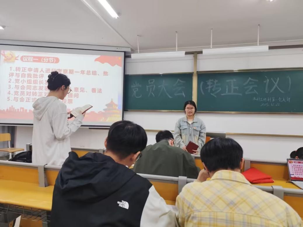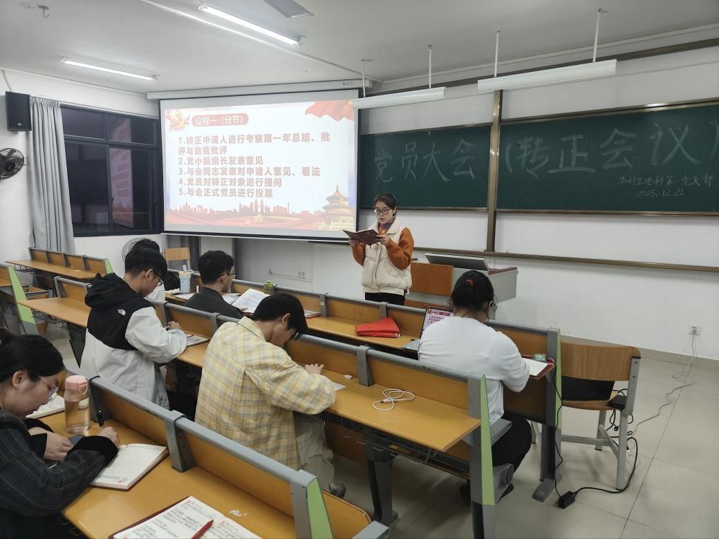 12月22日,情色动漫 本科生地科第一党支部在武鸣校区2号实验楼A-202教室顺利召开2025年12月预备党员转正会议。此次会议由党支部书记黄吉慧主持,党支部全体成员参加。